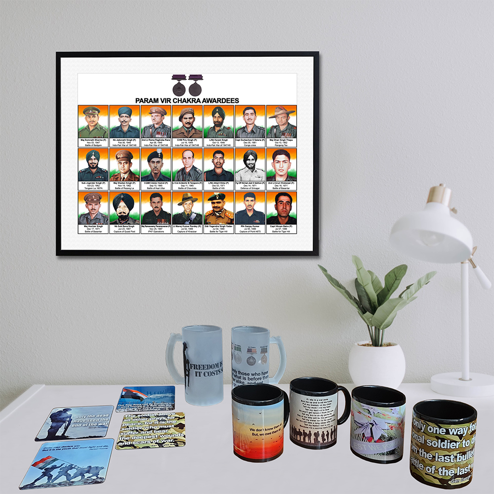 → One framed print on canvas in ~15″ x 18″ size with photographs of the 21 Param Vir Chakra (PVC) Awardees